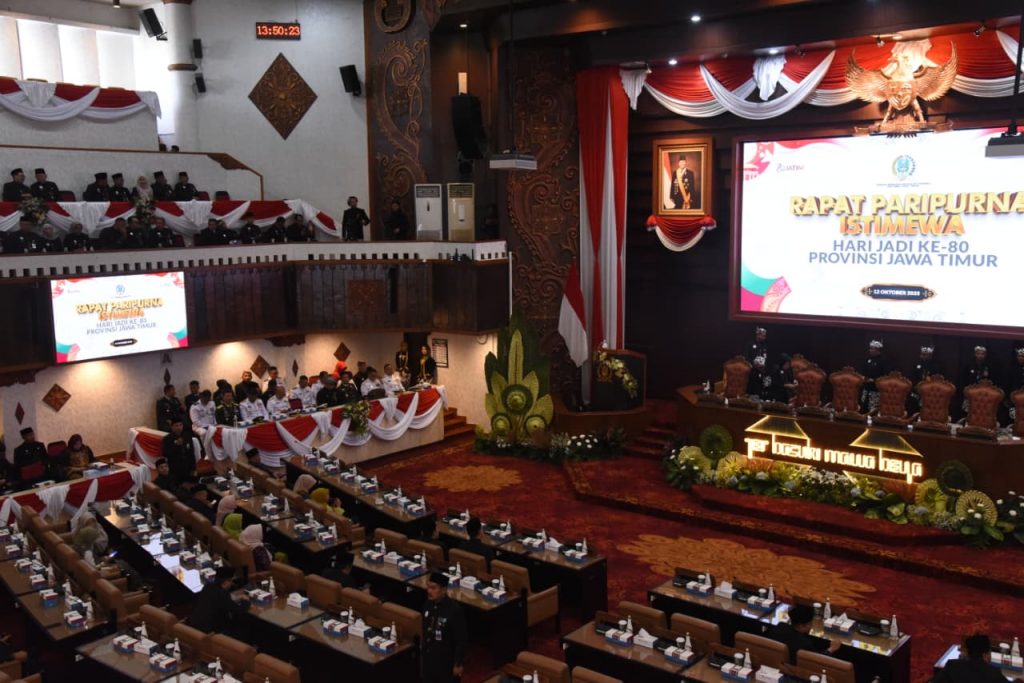 Dalam sambutannya, Ketua DPRD Jawa Timur menyampaikan bahwa rapat paripurna istimewa ini merupakan bentuk refleksi dan rasa syukur atas perjalanan panjang Provinsi Jawa Timur yang telah berusia delapan dekade.“Delapan puluh tahun adalah usia yang matang bagi sebuah provinsi. Jawa Timur telah tumbuh menjadi salah satu daerah dengan peran strategis dalam pembangunan nasional. Momentum ini menjadi pengingat untuk terus memperkuat sinergi antara pemerintah daerah, DPRD, dan seluruh elemen masyarakat,” ujarnya.