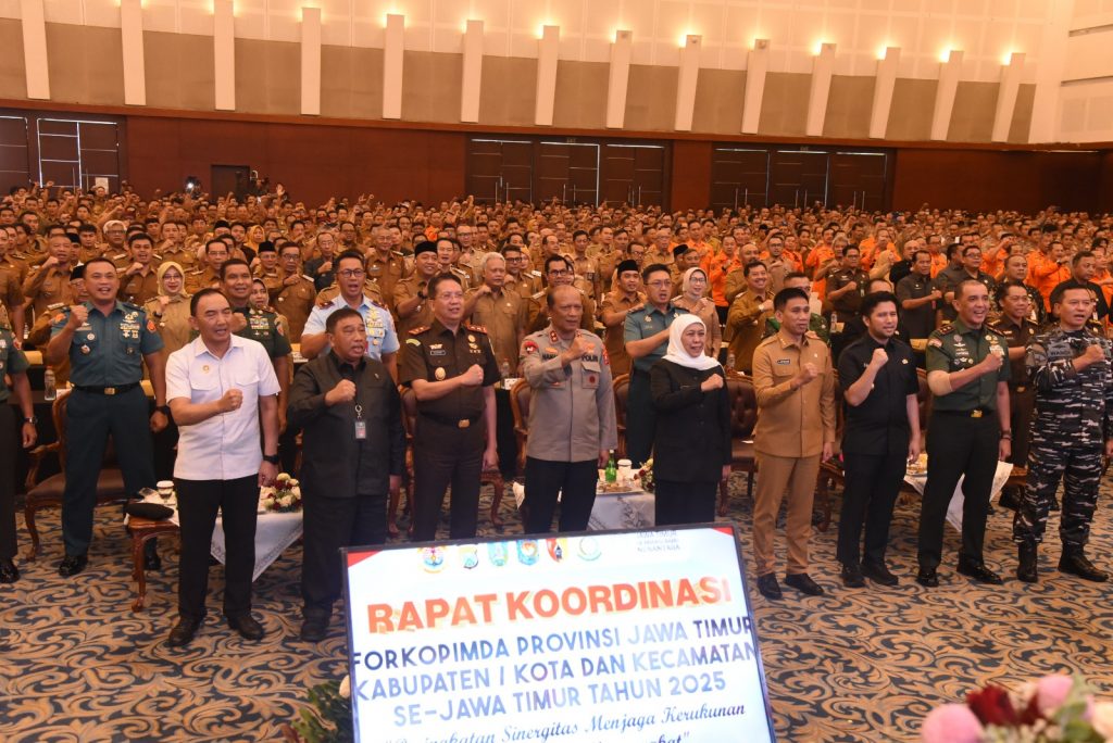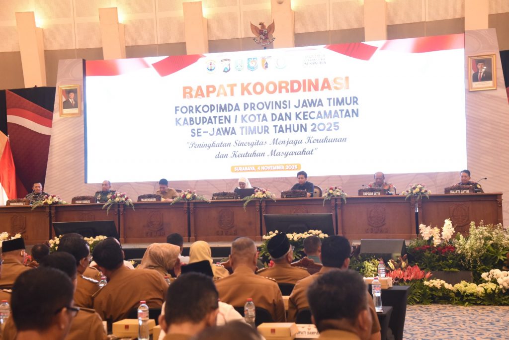 Surabaya, — Pemerintah Provinsi Jawa Timur melalui Forkopimda (Forum Komunikasi Pimpinan Daerah) Provinsi Jawa Timur menggelar Rapat Koordinasi bersama Forkopimda Kabupaten/Kota serta Forkopimda Kecamatan seluruh Jawa Timur yang dilaksanakan di Grand City Convention Surabaya, Kegiatan ini dipimpin langsung oleh Gubernur Jawa Timur (Hj.Khofifah Indar Parawansa) selaku Ketua Forkopimda Provinsi Jawa Timur dan dihadiri Dankogartap III/Sby selaku Pangdam V/Brawijaya, Kapolda Jawa Timur, Kajati Jawa Timur, Kabinda Jawa Timur, Kaskogartap III/Sby (Brigjen TNI (Mar) Danuri, S.M) serta jajaran pejabat terkait lainnya. Selasa (4/11/2025)