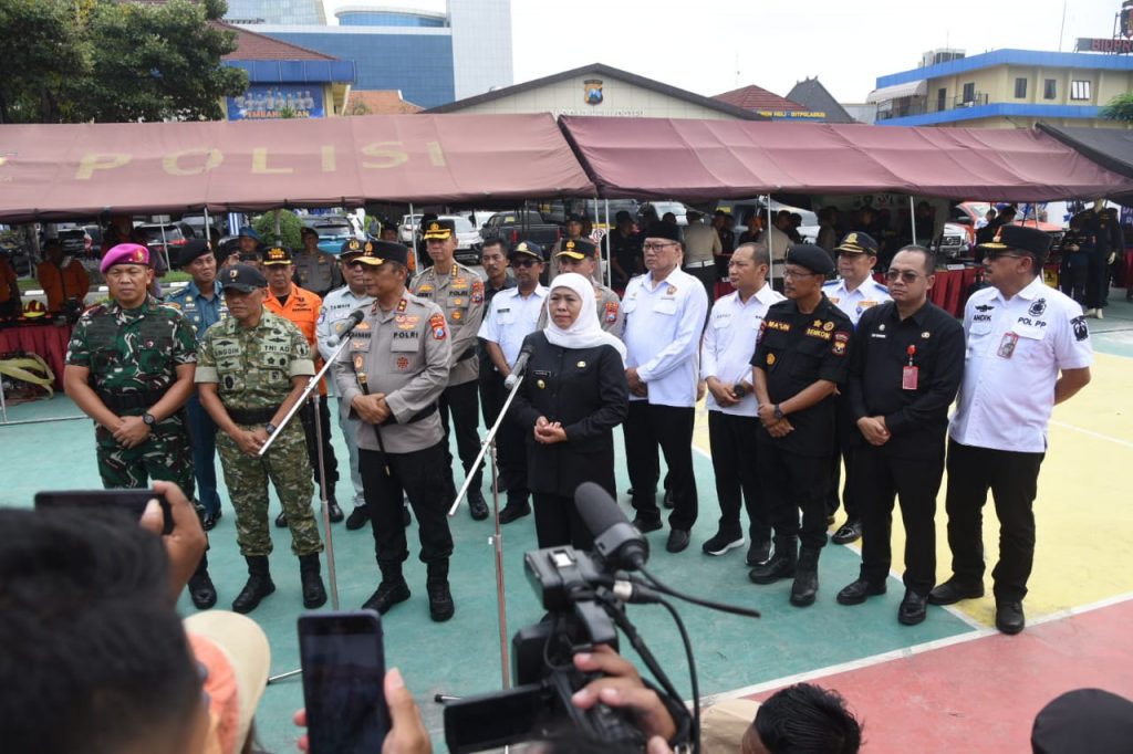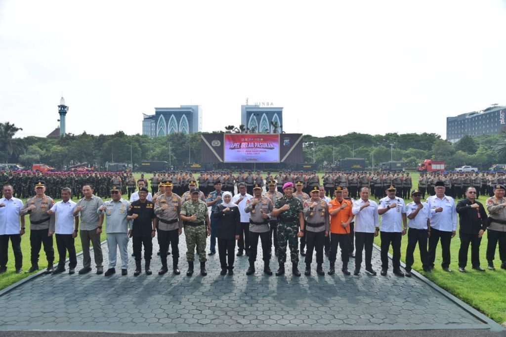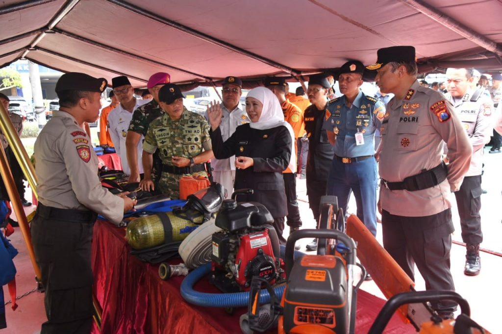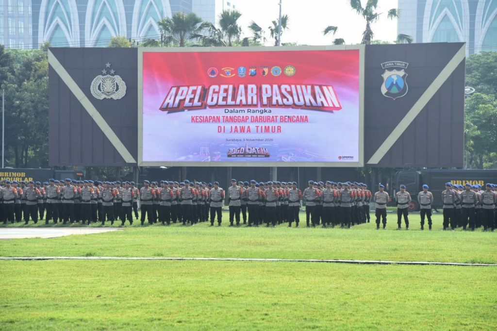 SURABAYA – Forum Koordinasi Pimpinan Daerah (Forkopimda) Jawa Timur melaksanakan Apel Gelar Pasukan Kesiapan Tanggap Darurat Bencana di Lapangan Apel Mapolda Jatim, Hadir Kaskogartap III/Surabaya (Brigjen TNI (Mar) Danuri, S.M.) yang di wakili Asops Kogartap III/Sby (Kolonel Mar Imam Ghazali, M.Tr., Opsla., dan diikuti oleh unsur TNI, Polri, BPBD, Basarnas, dan berbagai instansi pemerintah daerah sebagai bentuk kesiapsiagaan menghadapi potensi bencana di wilayah Jawa Timur.